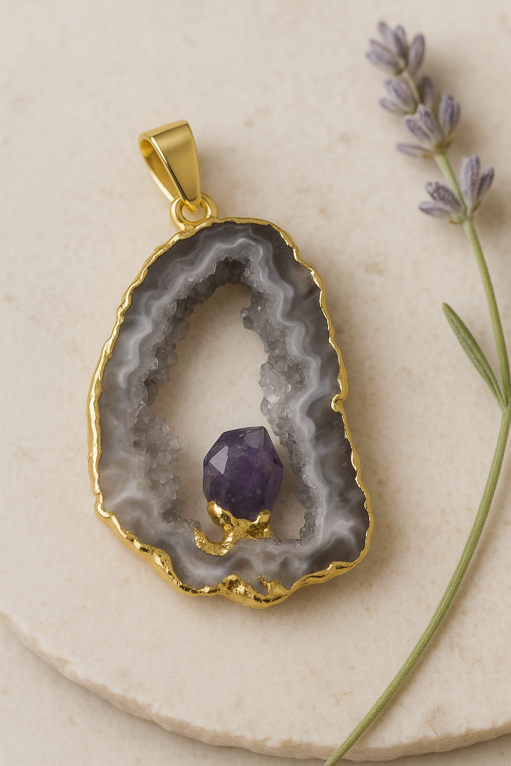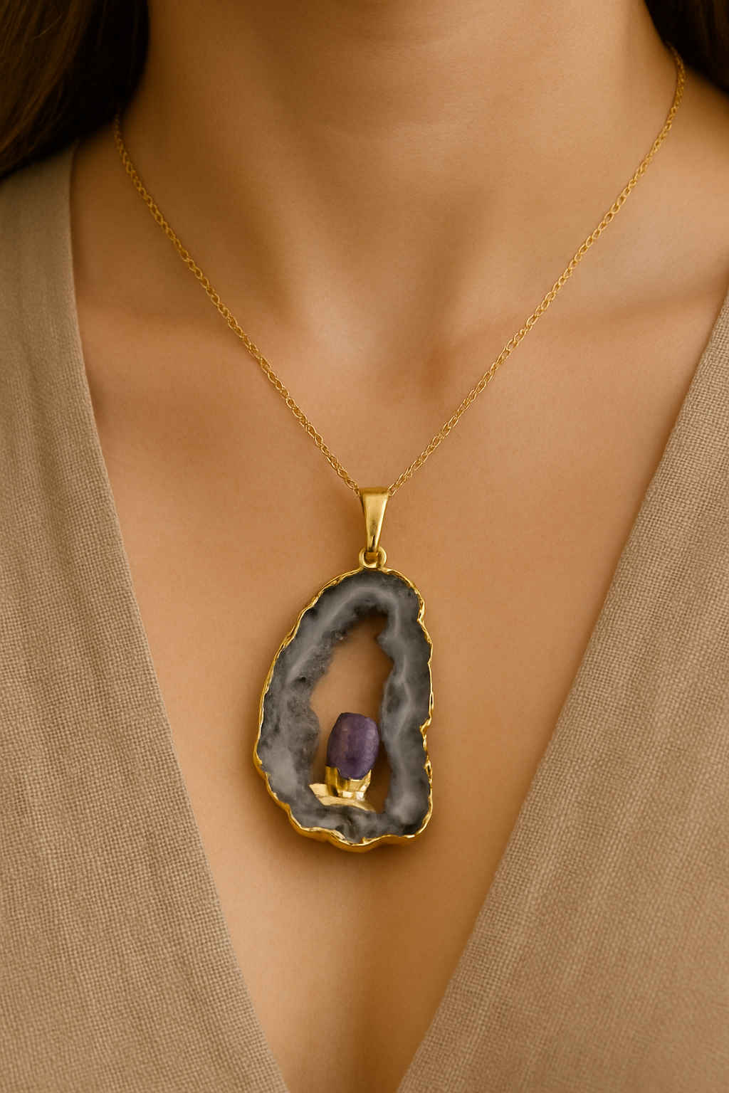 Dieser edle Kettenanhänger vereint die rohe Schönheit der Natur mit einem Hauch von Luxus. Im Zentrum steht ein kraftvoller Amethyst, eingebettet in eine naturbelassene Geode, eingefasst in glänzendes Gold. Der Anhänger symbolisiert Balance, innere Ruhe und spirituelle Klarheit – perfekt für alle, die sich mit ihrer Intuition verbinden möchten.